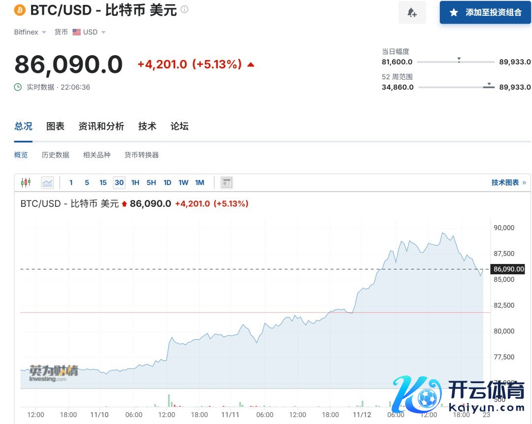 英为财情泄露,24小时内,比特币最飞腾至90070.1好意思元,随后全部走低,一度跌到85500好意思元近邻,截止发稿,比特币报86090好意思元。