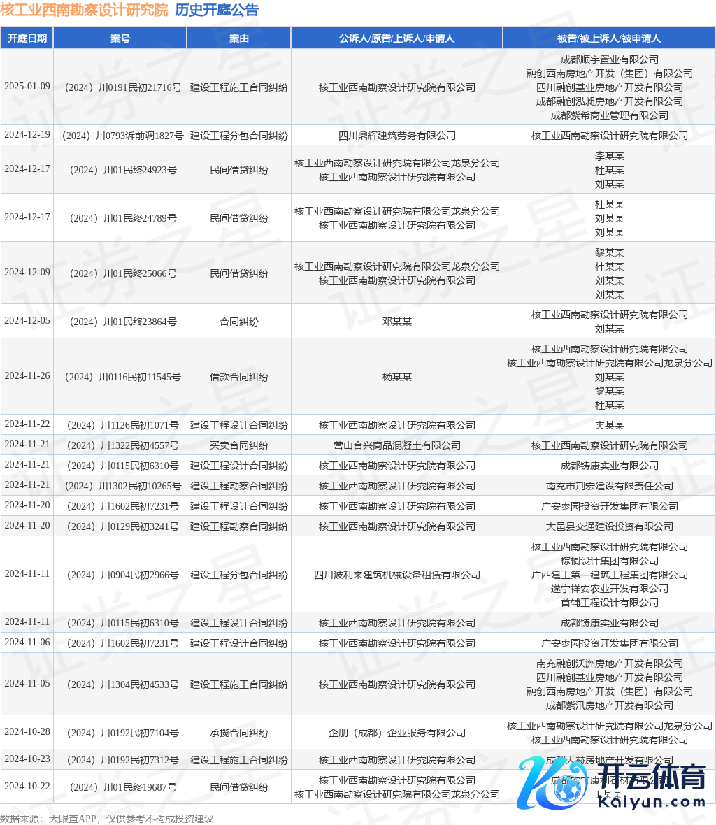 案号:(2024)川0116民初11545号审理法院:成王人市双流区东谈主民法院案由:借款公约纠纷当事东谈主信息: 原告/上诉东谈主:杨某某 被告/被上诉东谈主:核工业西南勘测狡计盘考院有限公司、核工业西南勘测狡计盘考院有限公司龙泉分公司、刘某某、黎某某、杜某某开庭日历:2024年11月26日凭证统计,近一年内以核工业西南勘测狡计盘考院有限公司为当事东谈主的历史开庭公告有68则,其中案由为“民间假贷纠纷”的公告以13则居首,其次为“建立工程狡计公约纠纷”有9则,“商业公约纠纷”有7则。历史开庭公告(前20条)如下:
