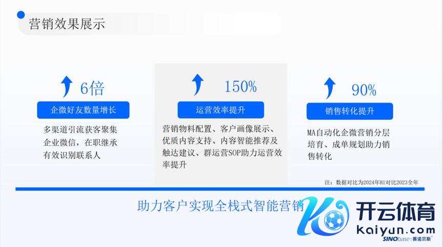 在赛诺贝斯的助力下,该企业政企业务部的企微运营获取了权臣奏效。企微好友数目大幅增长,多渠谈引流获客后果权臣,有用识别并剿袭了在任关联东谈主的资源。同期,营销物料的设立、客户画像的展示、优质实质的支合手以及实质智能推选及触达漠视等,齐极地面造就了运营效用。更垂死的是,通过MA自动化企微营销分层培育和成单策划,销售窜改率完结了权臣造就。数据裸露,2024年上半年比拟2023年全年,企微好友数目增长了6倍,运营效用造就了150%,销售窜改造就了90%。