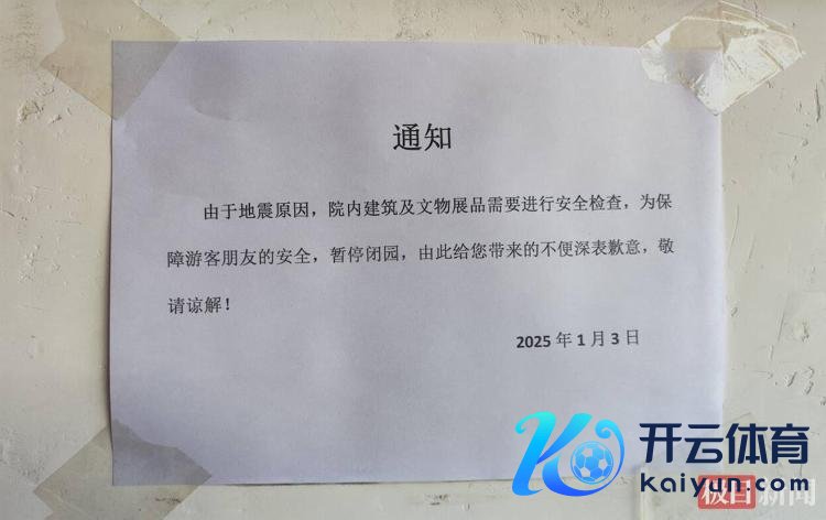 记者在景区东门外看到,一则1月3日的见告提到,由于地震原因,院内开导及文物展品需要进行安全查抄,为保险搭客一又友的安全,暂时闭园。