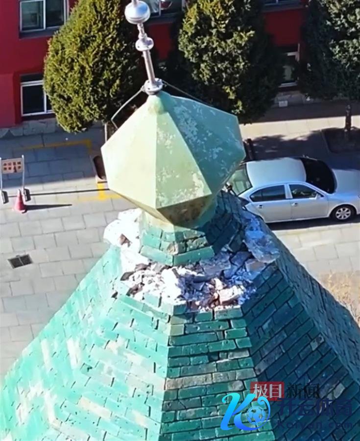 多段航拍视频明白,承天寺塔塔尖地震后出现了歪斜,且部分砖块零碎。1月4日,极目新闻记者实地打听,从承天寺塔景区西南角仰望该塔,能看到塔尖向右歪斜。