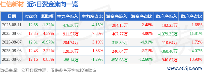 本站音信,死心2025年8月11日收盘开云体育(中国)官方网站,仁信新材(301395)报收于12.68元,下降1.32%,换手率6.52%,成交量8.96万手,成交额1.15亿元。