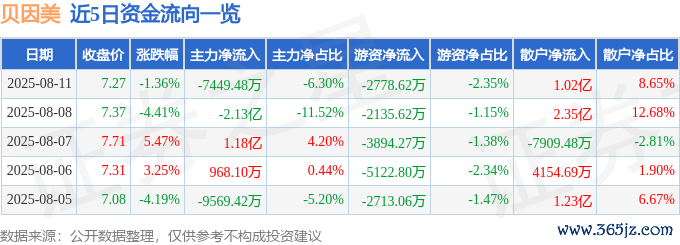 本站讯息,收尾2025年8月11日收盘,贝因好意思(002570)报收于7.27元,下落1.36%,换手率15.06%,成交量162.62万手,成交额11.82亿元。