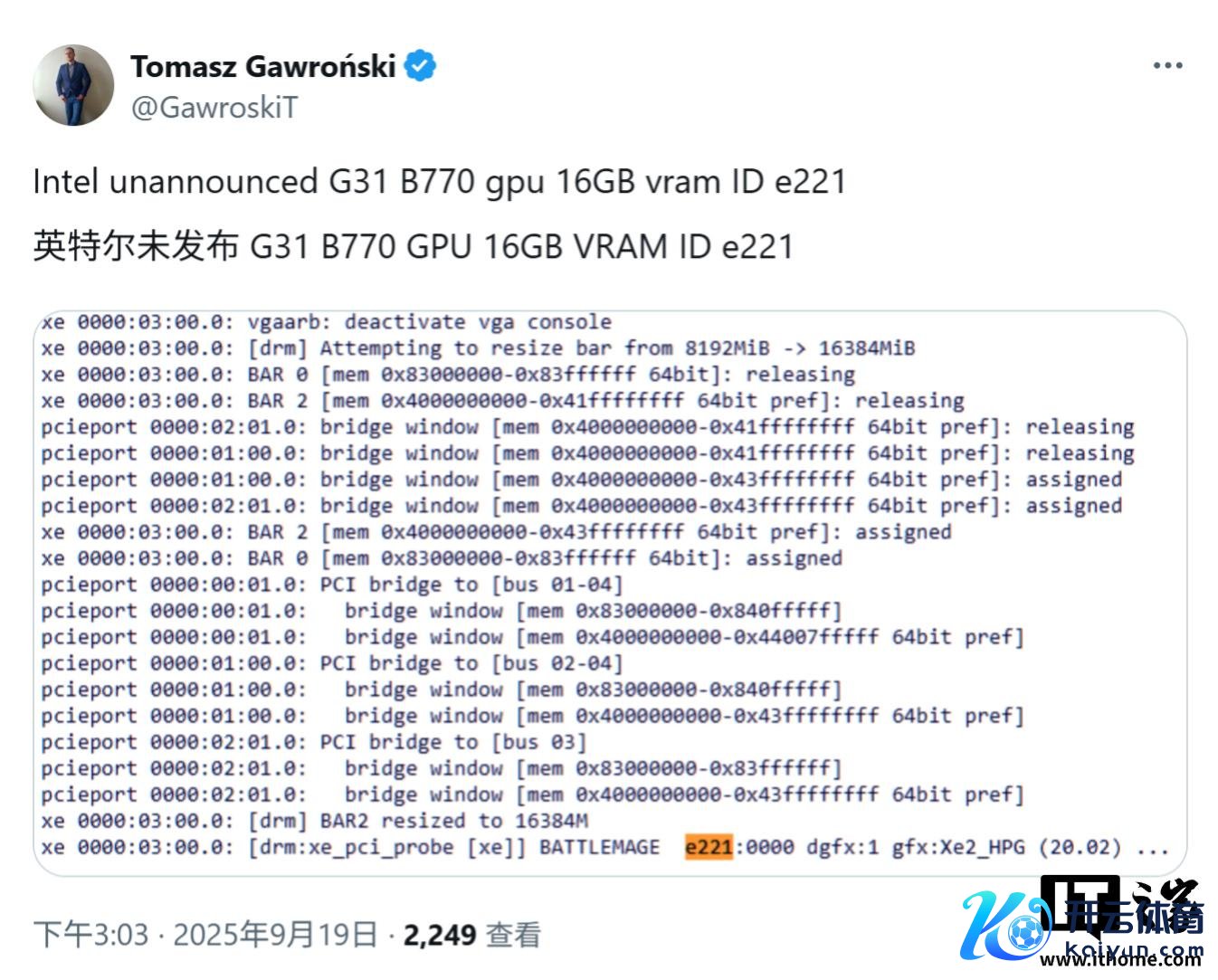 日记中还出现了 BAR2 调度至“16384M”的纪录,这很可能意味着该显卡搭载了 16GB 显存。聚拢此前信息,标明英特尔 Arc B770 已投入里面测试阶段。