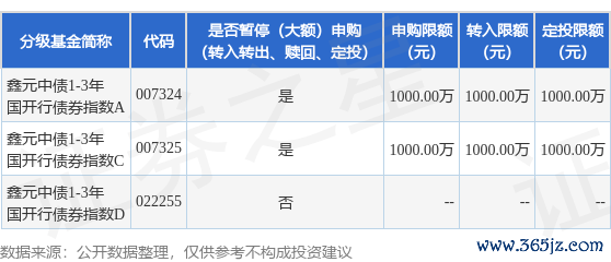 本站音尘,6月24日鑫元基金处理有限公司发布《对于鑫元中债1-3年国开行债券指数证券投资基金A、C类份额暂停大额申购(退换转入、如期定额投资)业务的 公告》。公告中指示云开体育,为保护基金份额捏有东谈主利益,自2025年6月24日起鑫元中债1-3年国开行债券指数证券投资基金A、C类份额暂停大额申购(退换转入、如期定额投资)业务的 ,下属分级基金调理明细如下: